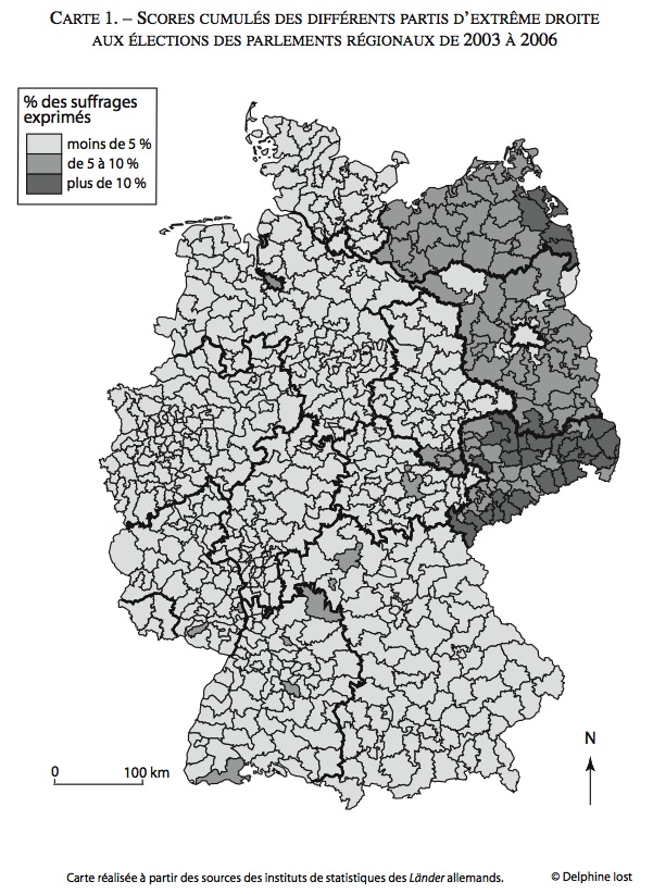 Dans la nuit du samedi 19 au dimanche 20août 2007, lors de la fête annuelle de la petite ville de Mügeln (5000 habitants) en Saxe, huit Indiens ont été agressés par un groupe de jeunes et, selon Kai Biermann du journal Die Zeit, sous les applaudissements de la foule. L’intervention de soixante-dix fonctionnaires de police en tenue antiémeute sera nécessaire pour disperser le groupe. Cette agression à caractère xénophobe a réactivé le débat au sujet de l’extrême droite en Allemagne. Un an après la déclaration d’Uwe-Karsten Heye, ancien porte-parole du gouvernement Schröder qui, à l’occasion de la Coupe du monde de football, mettait en garde les étrangers contre les risques d’agressions racistes dans certaines villes de l’ex-RDA, la polémique au sujet de l’implantation des idées d’extrême droite dans les nouveaux Länderest ravivée (carte 1).